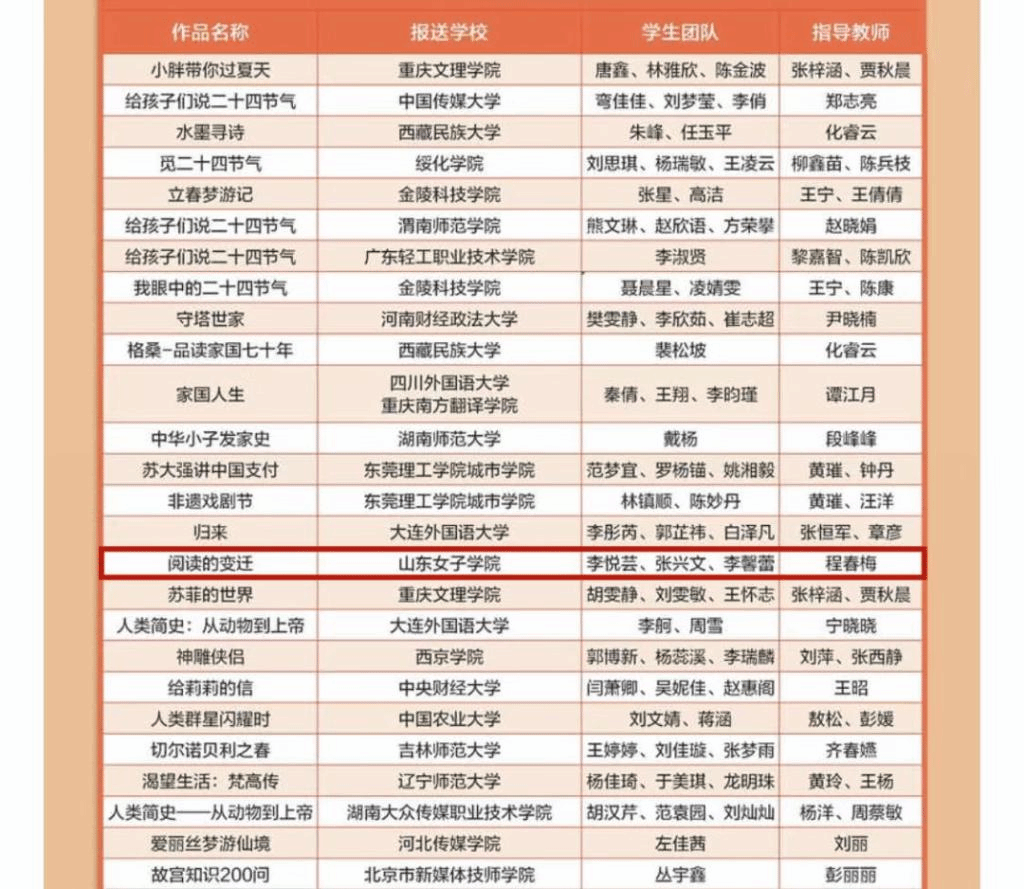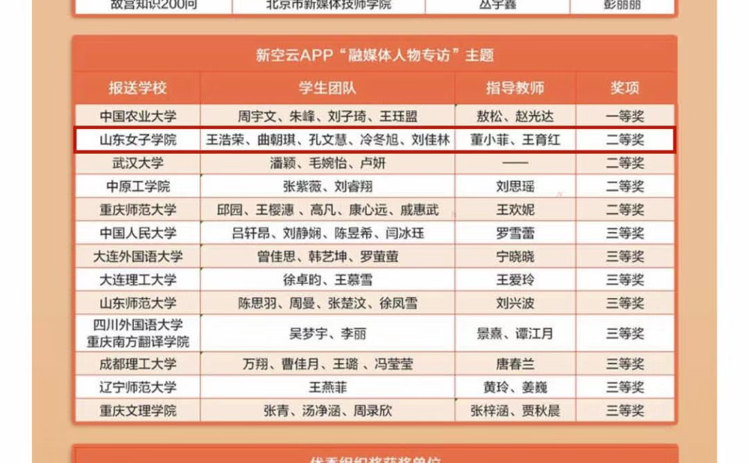 本次大赛于2019年3月正式启动,文化传播学院师生团队经过整整一年的不懈努力,从主题创意、专业技巧、新媒体应用、团队合作等多方面精心准备,不断打磨,最终2016级广播电视学专业学生李悦芸、张兴文、李馨蕾的作品《阅读的变迁》(指导教师:程春梅)获得H5作品优秀传播奖;2017级新闻采编与制作专业学生王浩荣、曲朝琪、孔文慧、冷冬旭、刘佳林的作品《育婴师》(指导教师:董小菲 王育红)获得融媒体人物专访APP类二等奖;文化传播学院获优秀组织奖。据悉,本次大赛山东赛区仅有山东师范大学和山东女子学院获奖。