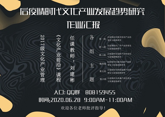 《文化产业前沿》课程是2017级文化产业管理专业的选修课,该课程就文化产业前沿理论问题与热点案例进行深入分析,强化学生运用文化产业基础理论知识分析前沿热点问题的能力,使学生的专业素养进一步形成并完善。课程以“后疫情时代文化产业发展趋势研究”为主题,采取了“教师引导+分组选题+作业汇报+现场答疑交流”的教学模式,立足行业、专业前言问题进行了分组调研,形成了调研报告。