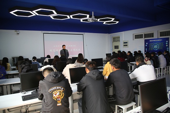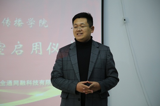 李百晓讲话时介绍了学院与山东全通网融科技有限公司开展校企合作的基本情况以及实验室的功能规划和作用,并向山东全通网融科技有限公司表示感谢。他表示,视觉传播实验室的建设启用,是学院进一步扩大实验室外延的新探索,也是校企合作、开放办学的一项新成果。视觉传播实验室的建设,为校企双方搭建了新的桥梁,将推动校企合作深度融合,开创优势互补、互动共赢的新局面。该实验室的建立,也为学院开展相关专业的实践教学提供了更宽广的平台,为培养适应社会需求的应用型人才创造了有利条件。同时,学院教师们也可以充分发挥实验室平台优势,实现“教学-教改-科研”三位一体化发展。最后,他鼓励同学们要珍惜学习机遇,提高专业素质,利用学院、企业提供的便利条件加强专业学习。