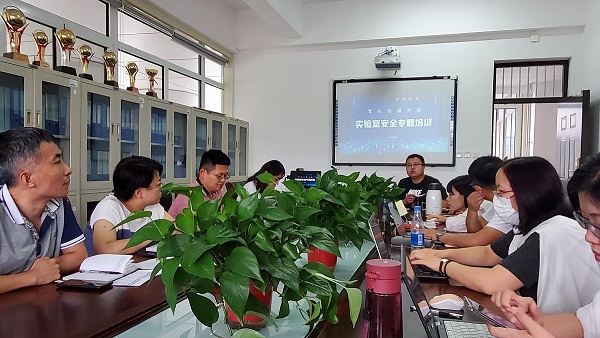 随后,学院在会议室举行实验室安全专题培训,学院全体教职工参加培训。实验员刘欢老师详细介绍了学院实验室的基本情况,学校、学院关于实验室安全管理的相关规定和学院实验室、设备借用需要注意的事项等,解答了老师们关于实验室安全、使用等方面的问题。