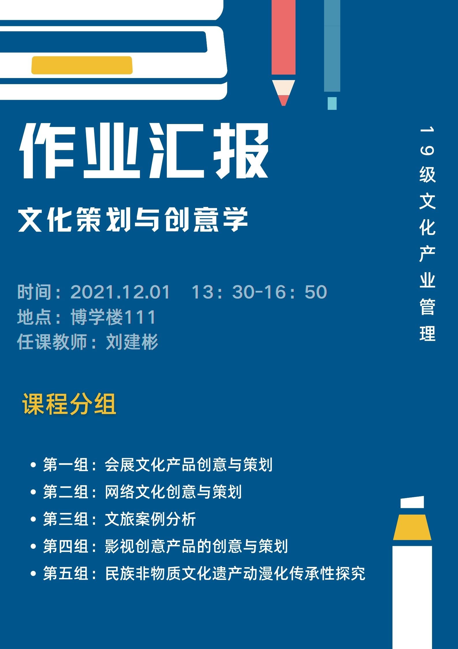 2019级文化产业管理全体同学完成了刘建彬老师讲授的《文化策划与创意学》的结课报告,经过本课程的学习以及老师的指导,2019文产的同学们将课上理论和课下实践相结合,并分了五个小组,从会展文化产品创意、网络文化创意、文化旅游、影视创意产品及民族非物质文化遗产动漫化传承五个方面,作了全面汇报。五组同学所展示的内容中的案例题材新颖、紧跟时事,选取的角度独特、充满洞见,汇报展现了当代文产青年的风采和自己独特的风格。同学们也一致认为经过这门课的学习提高了文化创意策划能力,对中国文化和文产发展现状有了更深的理解。展示过后能够感受到同学们对这个专业、对自己的未来充满了信心。这门课不仅提升了学生的专业技能,更促进了文化自信,体现了了“三全育人”和“思政育人”的特色。