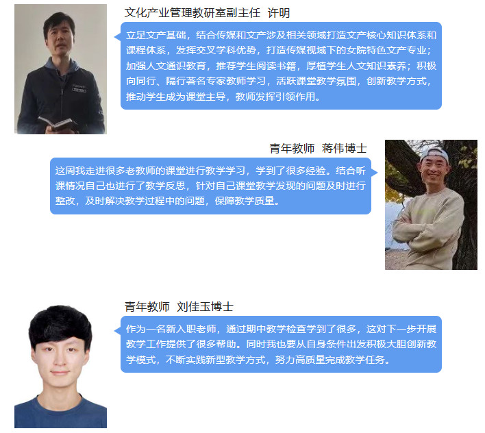 会上,教师们对课堂教学、专业发展献言献策,中年教师代表强调课程团队建设和师德师风建设的重要性,校兴方能我荣。青年教师代表分享从教以来的个人成长,认为扎实的教学、精湛的专业素养、纯净的教育情怀、执着的教研精神是作为新时代的教师应该具备的素质。