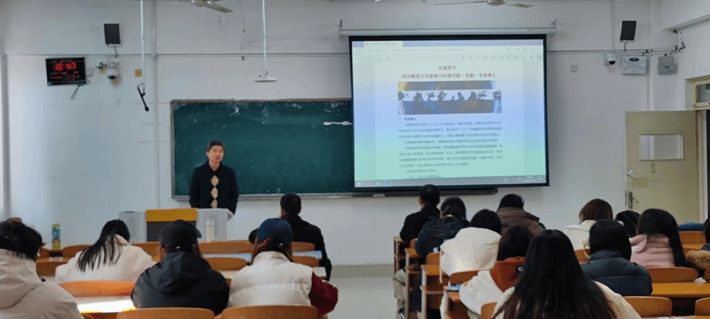 11月26日,四川师范大学影视与传媒学院副院长谢建华、副教授唐晋在博学楼301为传媒学院学生作戏剧与影视学专业考研宣讲,为传媒学院影摄专业、广播电视学专业学子介绍了考研方法与经验。传媒学院院长李百晓主持宣讲会。