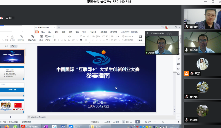 张记刚从“互联网+”出台背景、与其他校园赛事区别、赛道、奖项设置与解析、参赛资料要求及常见问题、地方院校突围建议等五个方面系统介绍了互联网+大学生创新创业大赛的背景、历年比赛情况,以大量的比赛项目实例结合学院实际情况对参赛提出了具体的意见建议。