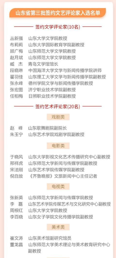 据了解,山东省签约文艺评论家制度设立于2015年,当年进行了首次聘任,2018年进行了第二批聘任。今年期满后,第三批签约文艺评论家名单已经完成公示。签约文艺评论家制度是中共山东省委宣传部、山东省财政厅、山东省文学艺术界联合会、山东省作家协会等共同研究制定,旨在宣传推介我省优秀文艺作品和优秀文艺人才,培养和造就一支思想水平高、专业能力强的文艺评论家队伍,提高我省文艺评论工作的组织化程度,形成在全国有影响力的文艺工作品牌。