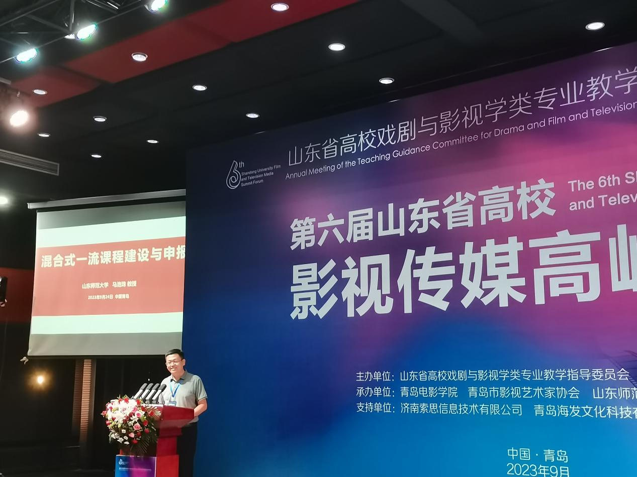 论坛报告环节,院长李百晓主持“混合式一流课程建设与申报”学术报告部分。山东省高校戏剧与影视学类专业教指委主任委员、山东电影家协会副主席、山东师范大学教授马池珠围绕传统课堂中的常见问题、资源开发、评价方式等方面重点讲授了混合式一流课程建设的申报做专题报告。