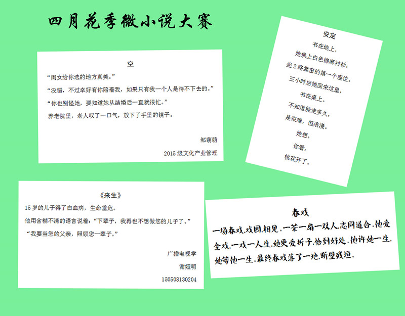 4月20日由文化传播学院生活部承办面向我院全体学生开展的微小说写作大赛活动圆满结束。经过工作人员初选以及微信投票最终2015级广播电视学谢娅明、2015级文化产业管理邹萌萌等同学获得奖项。