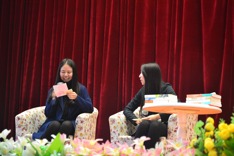 在同学们的期待中,三位作家如约而至。主持人简单的介绍了三位作者并献上学院的礼物,新书分享会正式开始。在分享过程中,同学们积极踊跃举手起立与作家互动或者通过写小纸条提出自己的问题,两位作者分别回答了同学们关心的问题,讲述了在写作过程中坚持梦想的故事,和成长路上或喜或悲的经历,她们真诚的分享真正的让作者从书中走了出来,走进了读者身边。