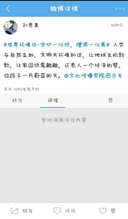 6月1日至6月7日,文化传播学院举办以“守护一份绿,增添一份美”为主题的保护环境微博宣传活动,倡导大学生保护环境,节约资源。