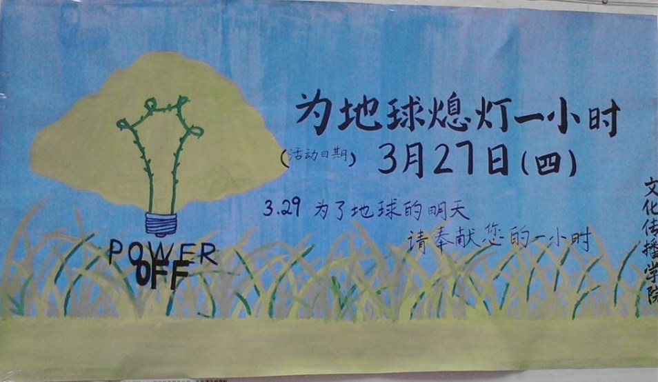 按照校团委的要求,我院积极响应号召,由学院宣传部设计活动海报进行宣传,号召广大同学加入到“关灯一小时”的环保活动中来,大力支持环保活动,提高大家的环保意识,让大家知道“保护地球,珍惜资源”的重要性。