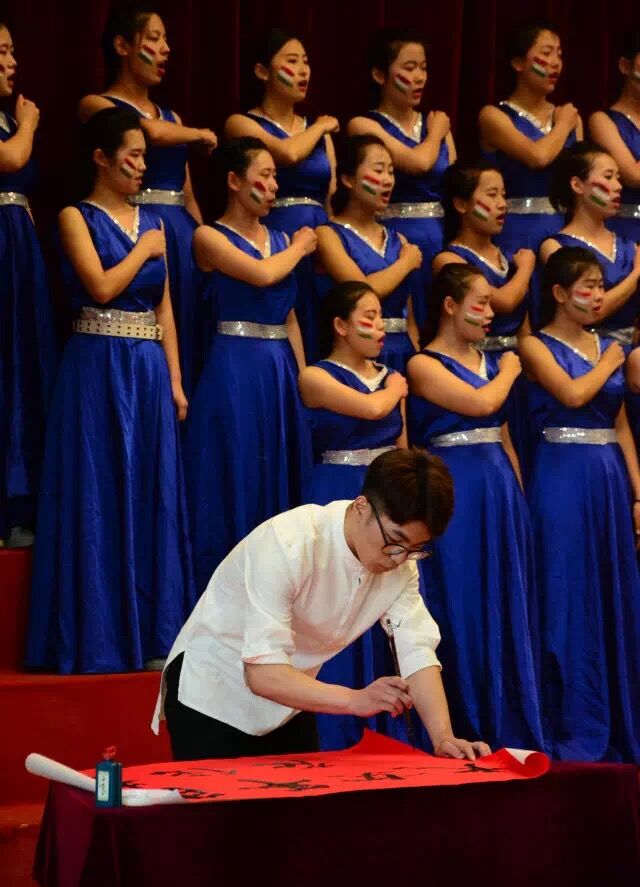 我院2015级和2016级参加了比赛,同学们用积极饱满的激情和高亢嘹亮的歌声歌颂了党的伟大。华丽大气的蓝色礼服、如花绽放的红色裙摆,向观众展示了文传学子的热情与活力。别具一格的合唱方式更是获得了在场评委和观众的一致好评。同学们融歌曲、舞蹈、书法、乐器于一身,向大家展示了一个无与伦比的文传。