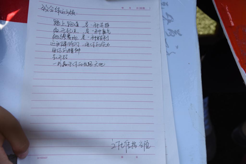他们默默地写下为运动员加油的话语:致跳远运动员,离弦箭式的助跑,蚂蚱似的起跳,空中似的走步表演,落地的瞬间,引起一片惊叹,你触到了沙的柔软。运动场另一角的吴磊好像知道了同学们的期望,他纵身一跃,奋力向前,希望他能够取得好成绩。