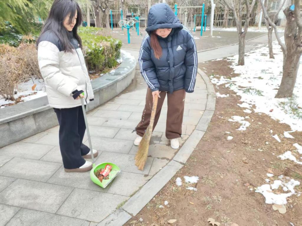 3月3日下午,传媒学院团委组织20余名共青团员,开展了“学雷锋 做志愿 办实事”主题志愿服务活动,以实际行动传递温情,守护社区安全与整洁。志愿者们身着厚衣,手持铁锹、扫帚等工具,分成多个小组迅速投入劳动。积雪清扫队重点清理主干道及单元楼门口的结冰路面,用铁锹破冰、扫帚清雪,开辟出一条条安全通道;卫生清洁组深入楼道、绿化带,细致擦拭扶手、清理杂物、捡拾垃圾,让社区环境焕然一新。