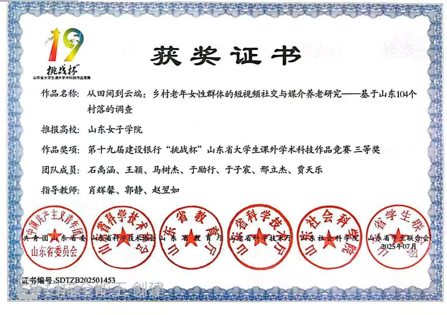 2025年6月4日至6日,在临沂大学举办的第十九届建设银行“挑战杯”山东省大学生课外学术科技作品竞赛中,山东女子学院传媒学院团队凭借项目——《从田间到云端:乡村老年女性群体的短视频社交与媒介养老研究——基于山东104个村落的调查》在众多项目中脱颖而出,获得省级三等奖,创造了学院在此项赛事中的历史最佳成绩。