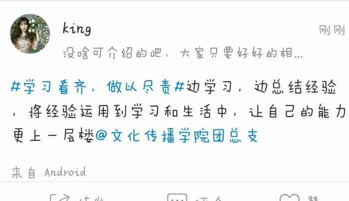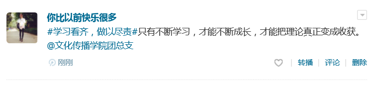 6月20-23日,山东女子学院文化传播学院团总支组织开展#学以看齐,做以尽责#微博话题活动,活动期间各支部的团员积极参与,通过微博表达了自己的看法。