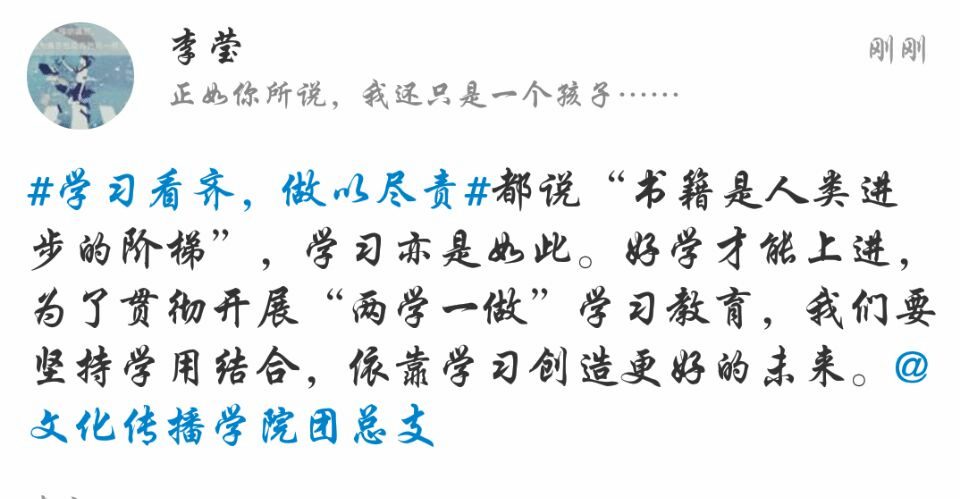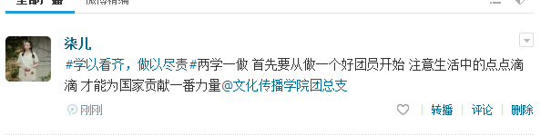 通过本次的微博活动,可以带动文化传播学院全体学生深刻体会“两学一做”的真正含义,努力做到“学”与“做”的有机统一。