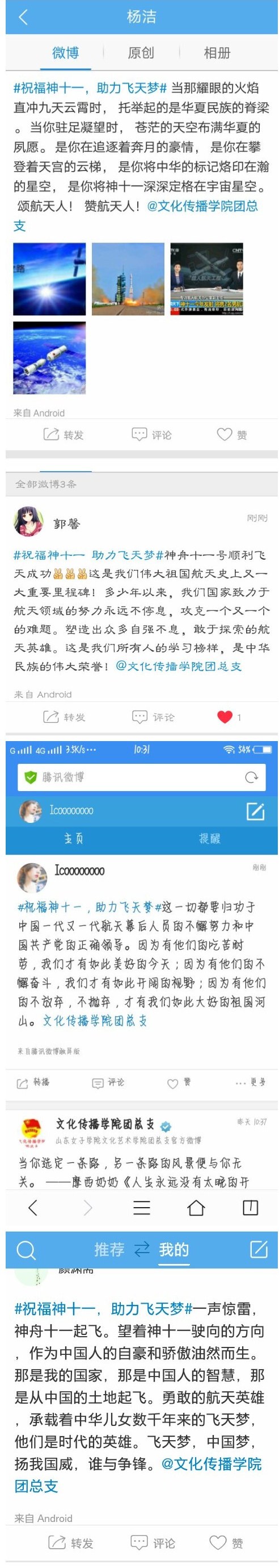 10月17日,神州十一号成功发射,计划在轨运行33天。为祝福神十一,致敬航天英雄,山东女子学院文化传播学院团总支组织开展了#祝福神十一,助力飞天梦#微博话题活动。