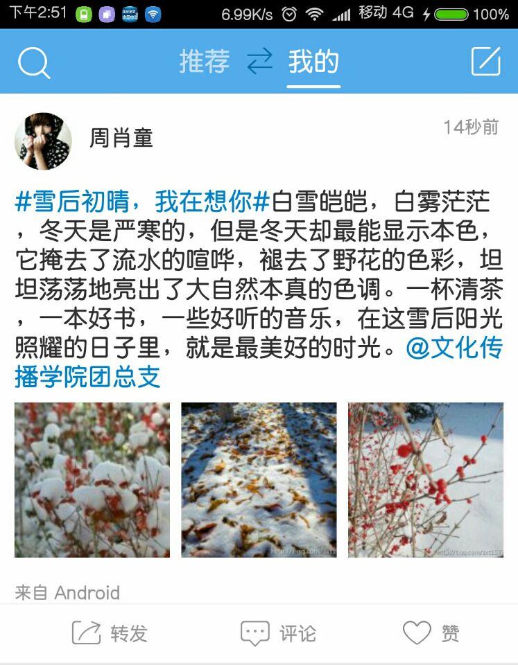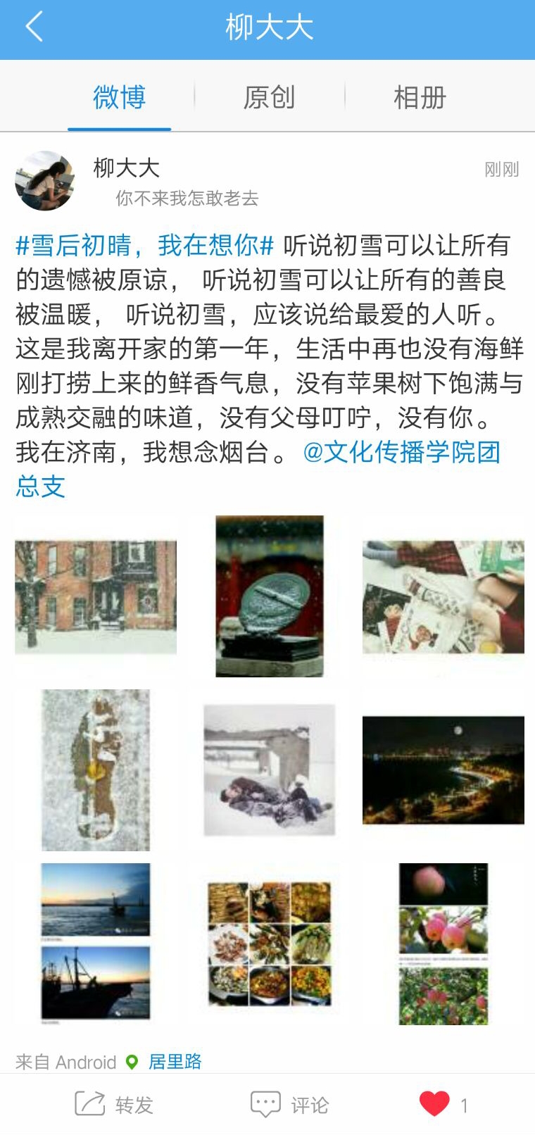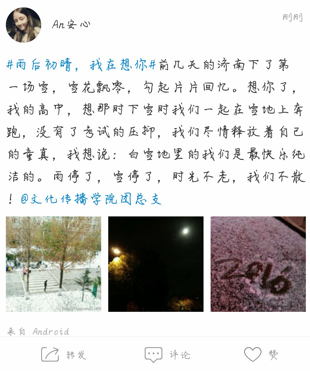 今冬初雪,悄然而至。雪后初晴,在素色的天地中想必大家也对家乡的亲人们充满了思念吧。为给同学们提供一个平台,抒发对亲友的思念,山东女子学院文化传播学院团总支于11月28日到12月1日开展了“雪后初晴,我在想你”微博互动活动。