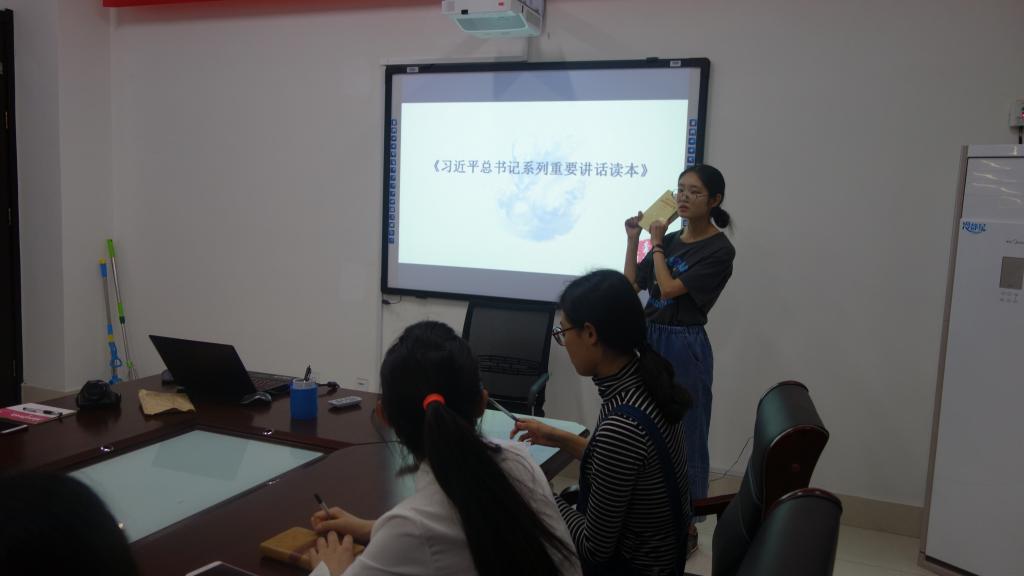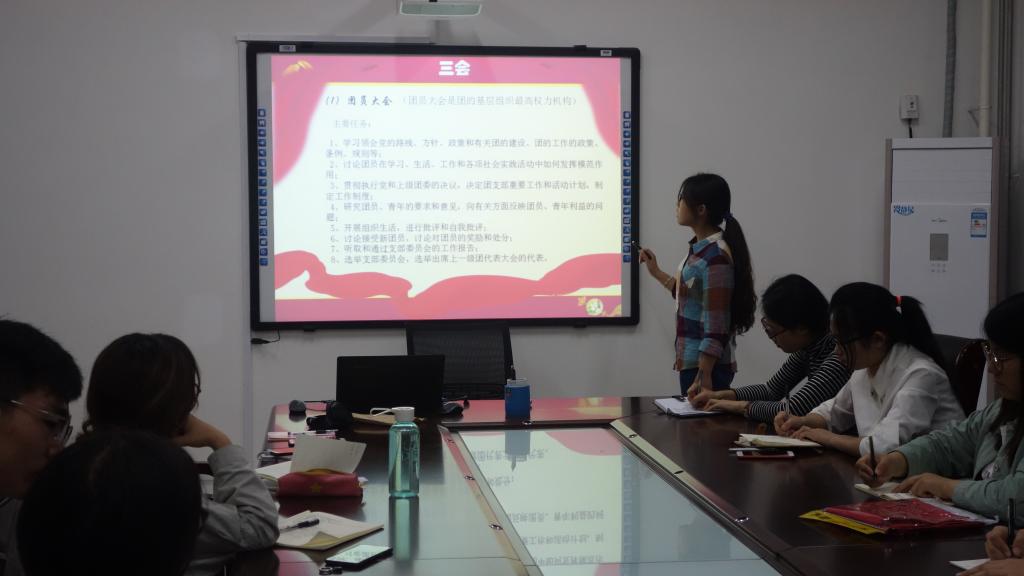 会议总共分为两部分。首先由2015级新闻采编与制作的董悦和许梦颖同学为团员们解读《 习近平总书记系列重要讲话读本》,两位同学结合自身经历和身边的案例,解读了中华民族历经沧桑却依旧乘风破浪、从自身出发如何坚持中国化、生活中如何实干兴邦、在共通世界中如何增强自己的话语权并扩大自己的影响力等一系列问题。第二部分由2016级广播电视学张艳芳和2016级文化产业管理王梦媛同学来解读“三会两制一课”实施细则,两位同学首先带领团员们重温“三会两制一课”的具体内容,再次为同学们巩固知识,并通过平时所开展的各种团学活动和会议来说明其中的内涵,最后从总的层面解读了“三会两制一课”的重要意义。