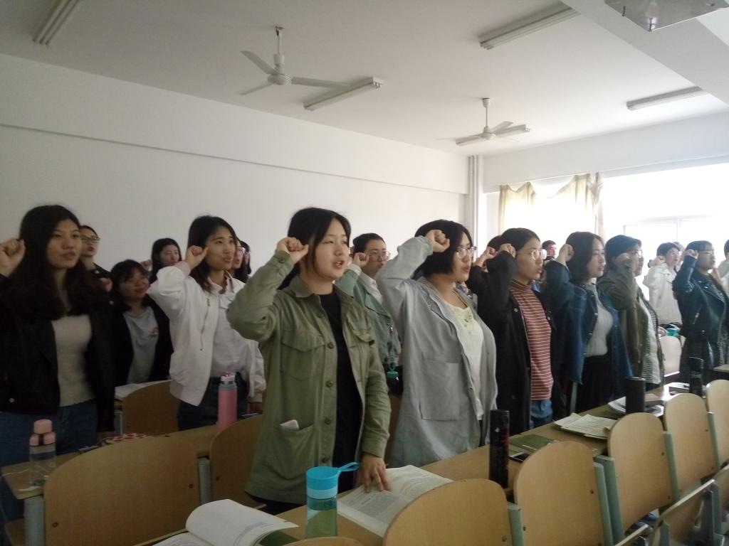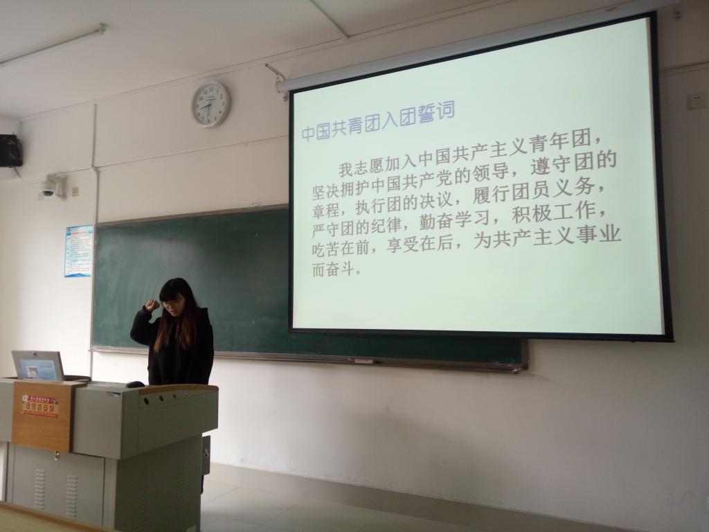 本次主题团日由各个团支部分别组织进行。首先,由团支书带领大家重温入团誓词,团员们全体起立,右手握拳,举起过肩,教室里回荡着团员们响亮的声音。紧接着,由团支书为大家介绍五四精神,团员们也在讲解中懂得了忧国忧民、热爱祖国、积极创新、探索科学的爱国主义精神,纷纷表示受益匪浅。最后,引用习总书记5月2日在北京大学师生座谈会上的讲话“青春理想,青春活力,青春奋斗,是中国精神和中国力量的生命力所在”作为结尾,激励团员们作为时代的主要力量,应担负起社会的责任,以崭新的精神面貌争创佳绩。