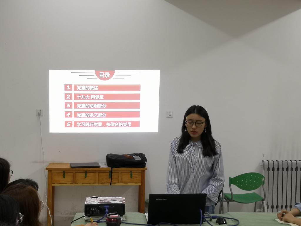 本次微党课由学生预备党员王晓青同学进行讲解,首先她通过PPT详细介绍了党章的组成部分,随后结合十九大报告中对党章的修改,带领大家进行了学习。《党章》的修改反映了中国共产党人实事求是、与时俱进的伟大品格,也是党不断自我革新、自我完善、走向强大的最好印证。随后,学生预备党员和积极分子就“谈谈对党章的认识”展开讨论,2016级文化产业管理专业杨文文说:“《党章》是我丈量自己的标杆,也是我鞭策自己的重要依据。”掌握《党章》的内涵,学习党的方针、路线,学习党的基本知识是每个党员、预备党员、入党积极分子必做之事,也是我们的责任和义务。
