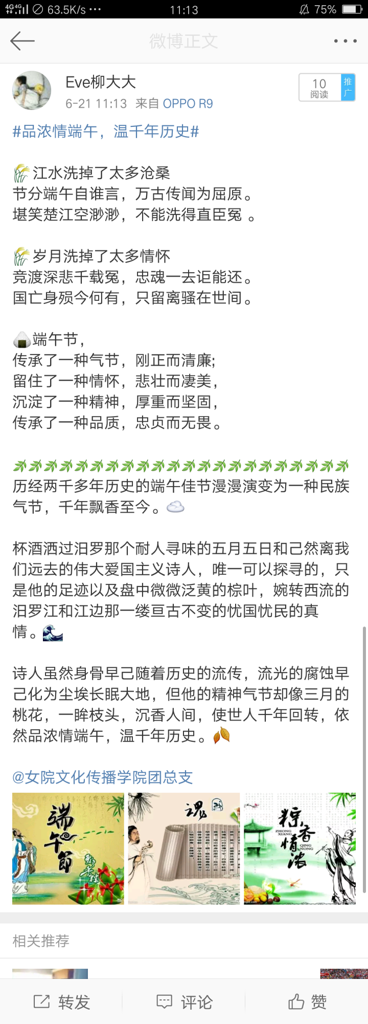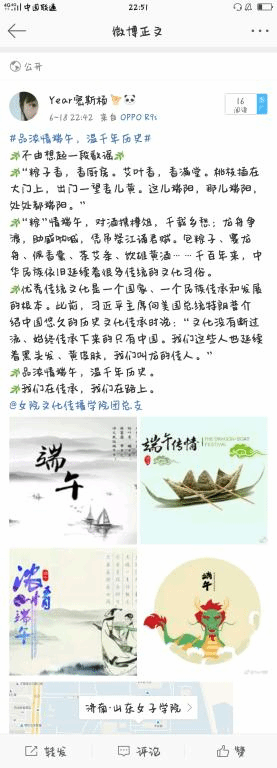 为引导同学们了解中华优秀传统文化,感受传统节日的魅力,山东女子学院文化传播学院团总支于6月18日至6月21日开展“品浓情端午,温千年历史”微博互动活动。
