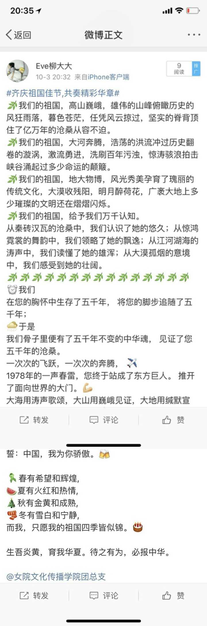 本次活动以腾讯微博为载体,通过发布话题#齐庆祖国佳节,共奏精彩华章#+想说的话及合适的配图来参与活动。活动发布后,同学们把自己的爱国热情通过文字表达出来,共同祝愿祖国69周年生日快乐。2017级广播电视学刘莹同学说:“在波澜壮阔的历史进程中,祖国砥砺奋进,如今,有一种骄傲,叫我有中国”。2016级文化产业管理专业柳怡玮同学说:“生吾炎黄,育我华夏。待之有为,必报中华。”很多同学也表示在新的历史征程中,祖国更加繁荣昌盛,我们也会更加努力的学习,为祖国明天奋斗;作为中华儿女,我们会在党的精神的指导下创造辉煌的未来;作为女院人,我们也将以高昂的斗志奔向未来。