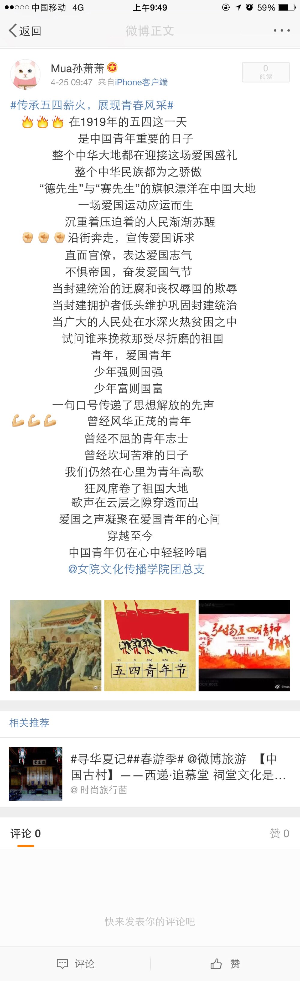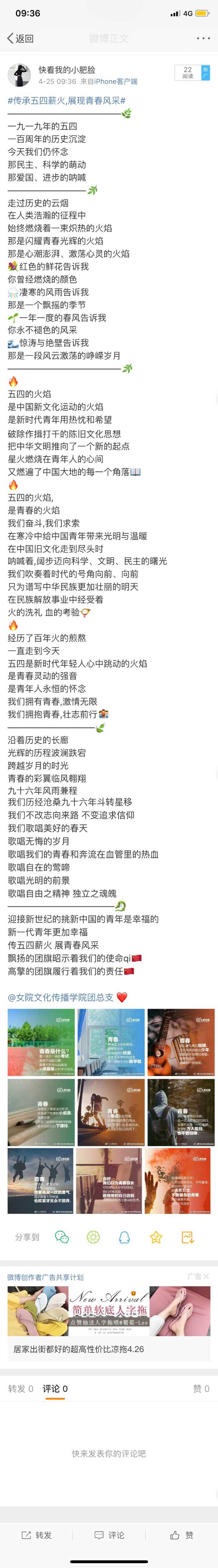 为纪念“五·四运动”100周年,传承“五·四”运动光荣传统,展现当代青年朝气蓬勃、奋发进取的精神风貌。山东女子学院文化传播学院团总支于4月22日至25日开展“传承五四薪火,展现青春风采 ”微博话题活动。