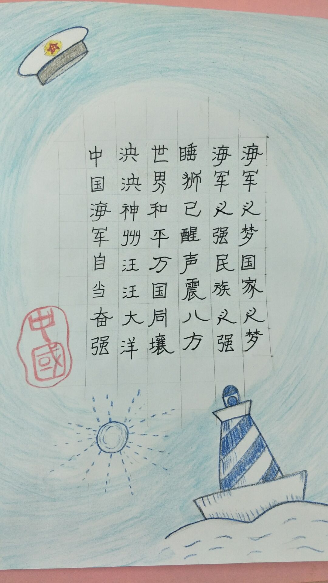 活动参与形式分为硬笔和软笔,有书法基础和爱好书法的同学表现出强烈的参赛意愿。在活动过程中,同学们为书写关于阅兵相关内容,特意实时关注海上阅兵信息,为的是在书写内容上更胜一筹。2016级文化产业管理2班的刘瑞琪同学通过书法写下了近年海上阅兵的盛况,其字迹铿锵有力,能从力道中感受到投射出的中国力量。2018级新闻采编与制作2班的陈雨同学娟秀的字体写下了深蓝航迹,用中华书法的魅力来书写新时代中国的实力。