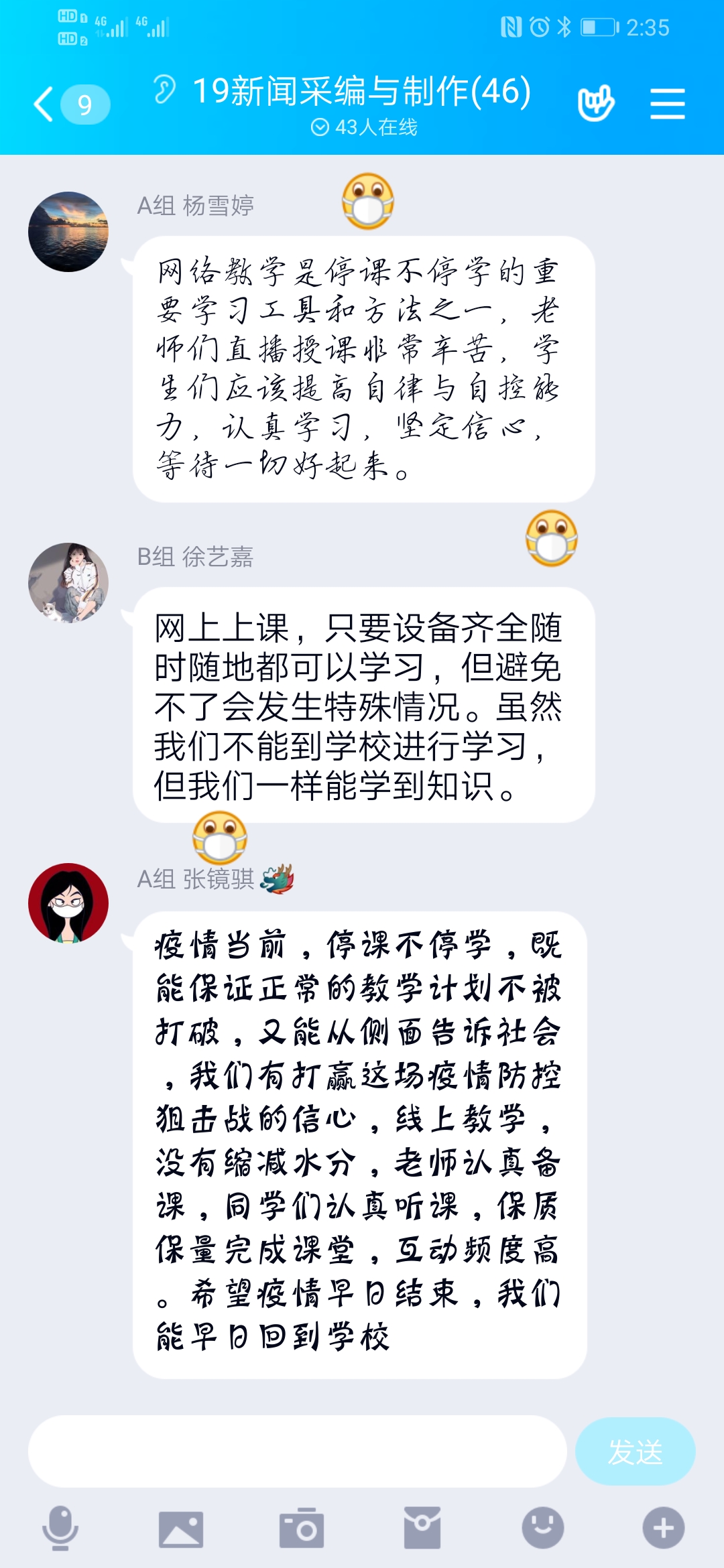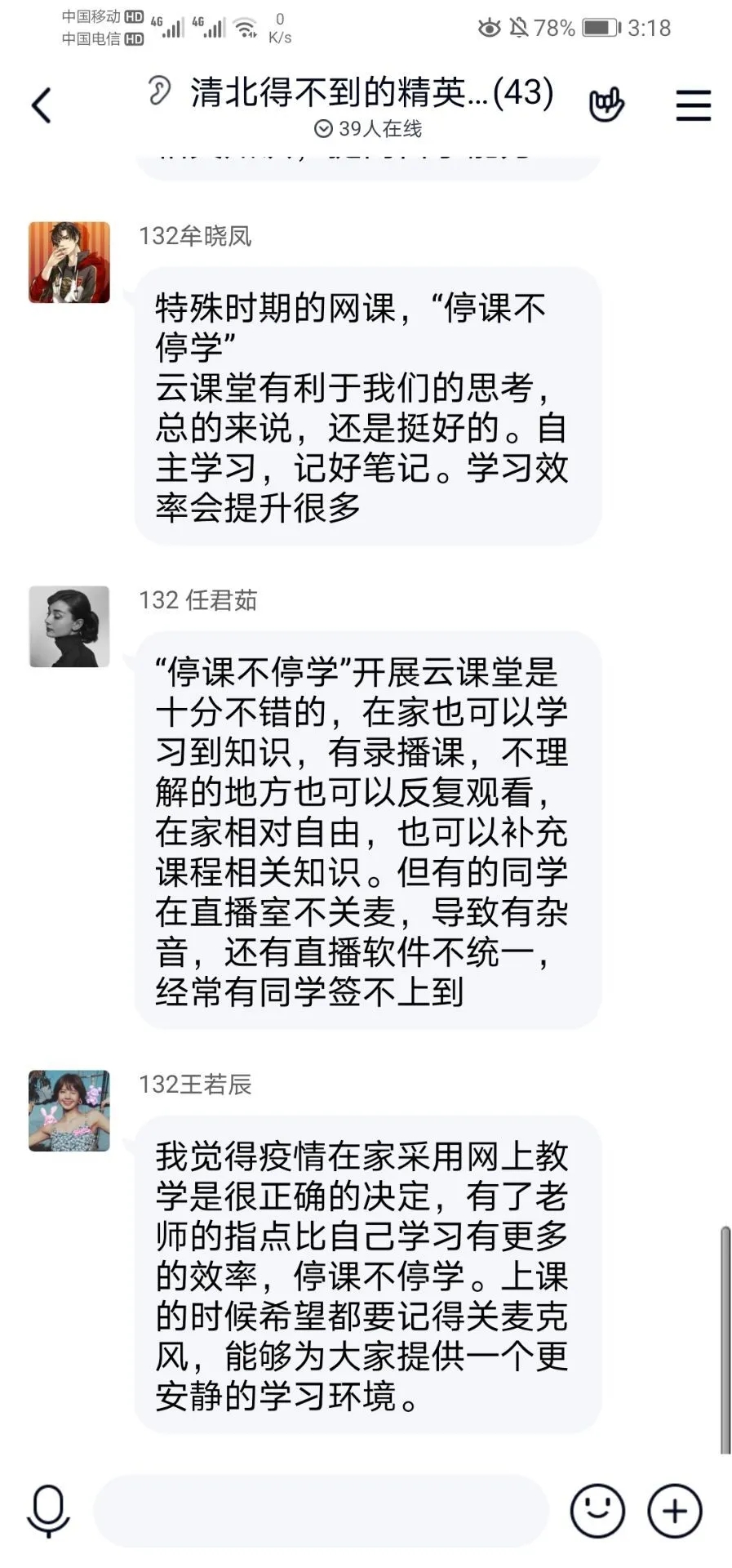 本次活动面向学院全体同学,利用互联网线上的方式开展。同学们共同观看视频,学习习近平总书记关于新冠肺炎疫情的重要讲话精神,然后对“如何上好网络课”展开讨论,2019级文化产业管理高熙蕾同学说:“上好网络课,要制定网络课堂自律公约,做好课堂秩序维护和学习互助工作,最重要的还是靠同学们自己的自觉和维护。