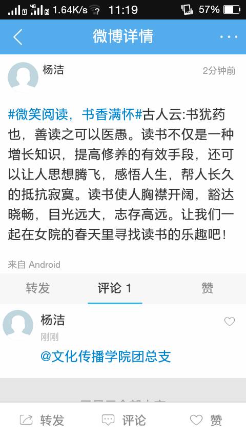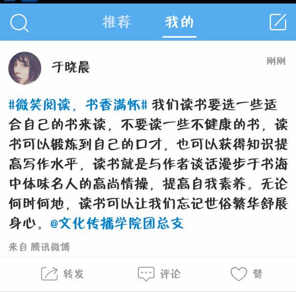 本次活动中,文化传播学院学子在微博上踊跃发言,表达自己对读书的喜爱,分享自己的读书心得。2015级新闻采编与制作2班的曹娜军同学在微博中写到:“书籍是人类进步的阶梯,在雨天或在晴天,坐在窗边,手边一杯清茶,心清神旷。我们可以在书籍中收获别人的人生情怀,感悟不同的情感。微笑阅读,书香满怀。”14级新闻采编与制作专业的李晓玲同学也在读书的过程中学会了独处。许多同学的微博内容得到了很多转载与评论,引起了积极响应。