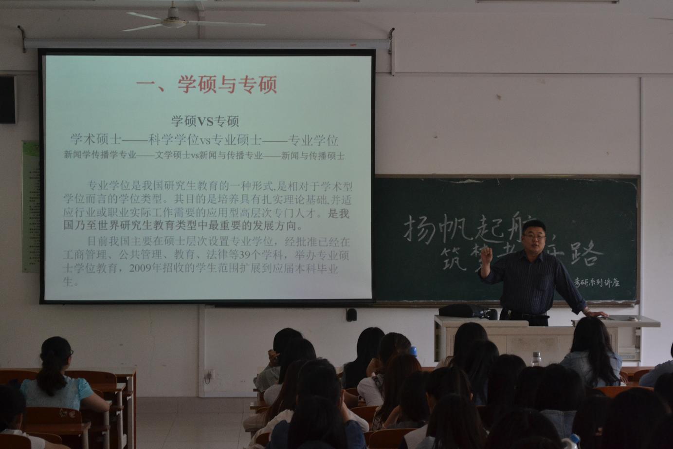 5月14日下午,由文化传播学院举办的“助力考研,筑梦考研路”系列讲座在合班楼202成功举办。文化传播学院副院长成曙霞主持本次讲座,山东大学新闻传播学硕士研究生导师、副教授倪万应邀主讲,2012级广播电视新闻学专业、2013级文化产业管理专业、2013级广播电视学专业的学生参加本次讲座。