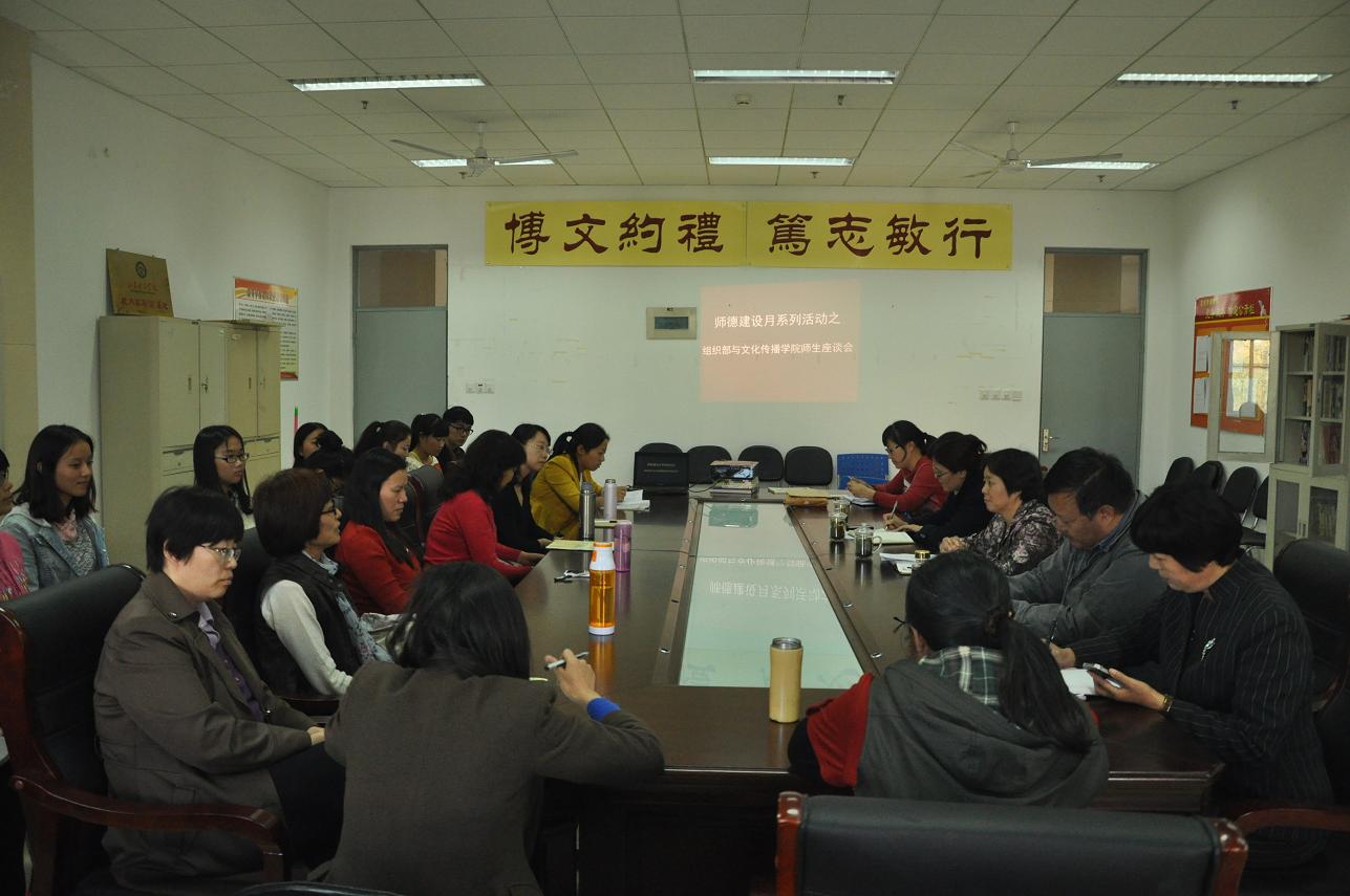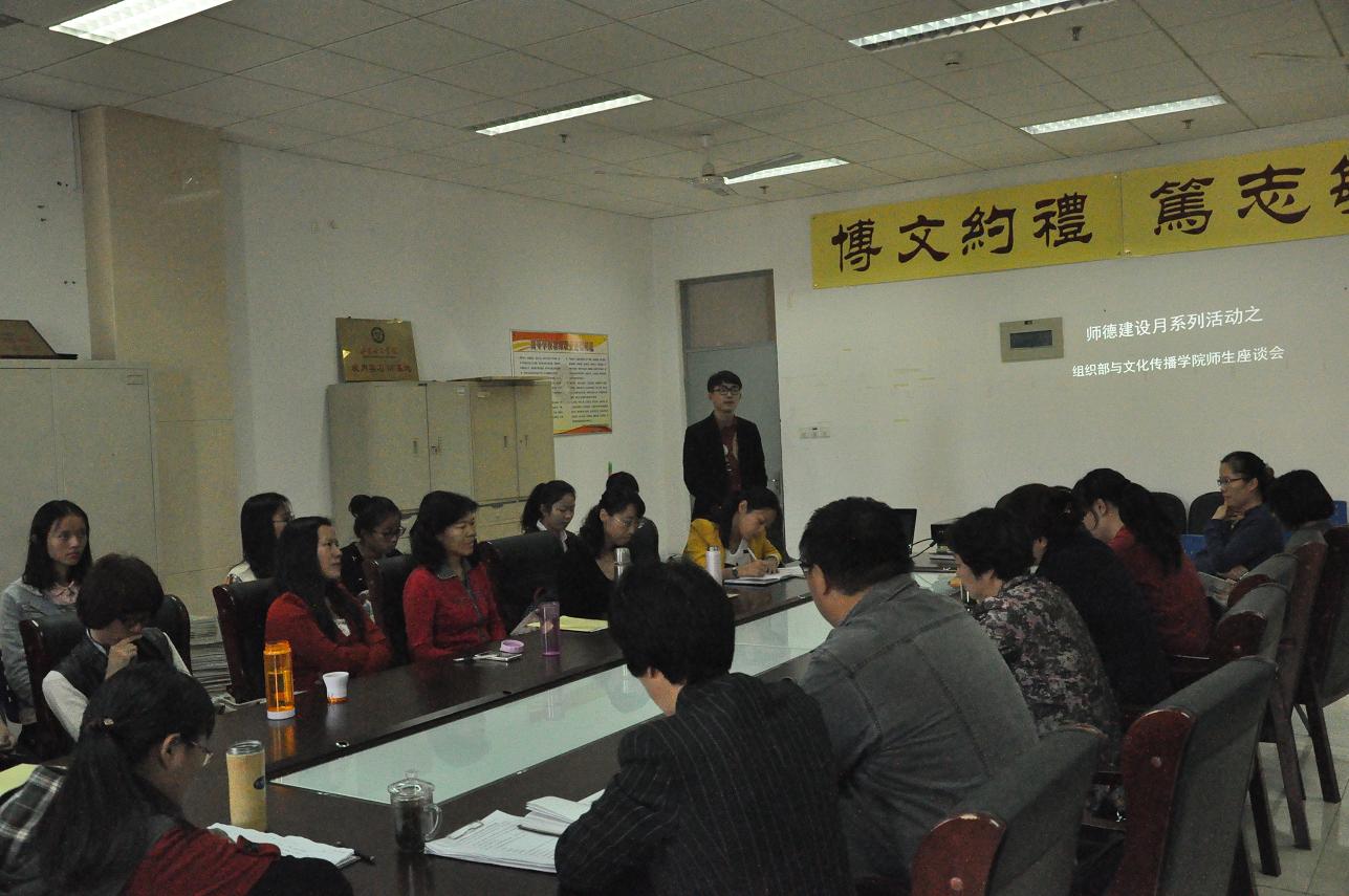 为了加强师德师风建设,深入学习习总书记在北师大教师节上的讲话精神,10月16日下午1:30,组织部党支部走进基层, 在图书馆B座208与文化传播举办了“师德建设月系列活动之组织部与文化传播学院师生座谈会”。参加本次会议的有组织部田艳玲部长、张农副部长、文化传播学院全体教师和学生代表。会议由鲁晓平副书记主持。