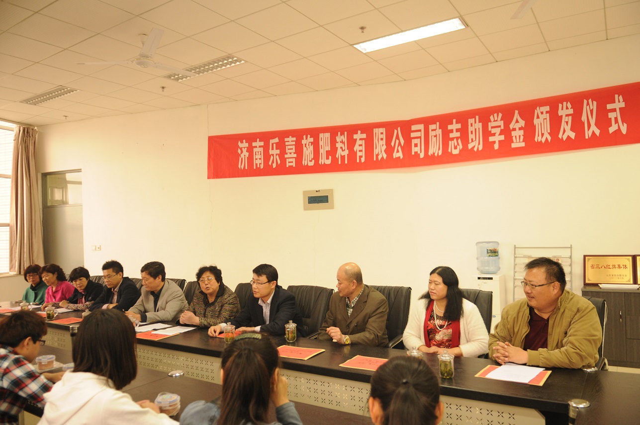 在励志助学金颁发仪式上,唐锡光院长介绍了乐喜施肥料有限公司的企业发展情况。宿建沛书记代表学校向受资助的各位同学表示诚挚的祝贺,向慷慨捐资的济南乐喜施肥料有限公司表示衷心的感谢,并鼓励受资助的各位同学要有战胜困难的信心和勇气,希望同学们能够感受企业和社会各界的温暖和呵护,怀有一颗感恩的心,珍惜和用好奖学金。乐喜施肥料有限公司郭明瑞总经理发言表示这次励志助学金颁发是他们企业教育资助的一个开始,将来这个项目要继续做下去,要更好地回馈社会。校党委委员、副院长贺兴利在发言中指出,作为业界翘楚,乐喜施肥料有限公司积极投身于教育事业的资助活动,通过开展多种形式的校企合作,为广大贫困学生铺平了求学的道路。他希望各位同学能够以更大的成就回报学校、企业和社会。受资助学生代表发言表示会怀着感恩的心去认真学习,用知识武装自己,早日成为高素质、高标准的社会有用人才,为将来回报社会打下坚实的基础,将爱心传递下去。