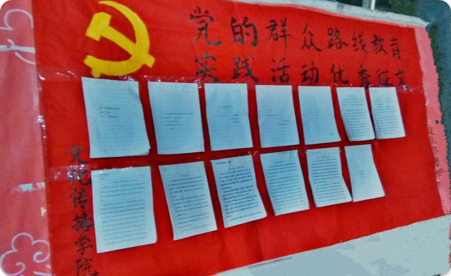 为广泛宣传党中央关于在 “在全党自上而下的分批开展党的群众路线教育实践活动”指示精神, 按照学生工作处的部署,文化传播学院团总支和学生党支部在全院学生中开展了以“党的群众路线”为主题的征文活动。此次活动旨在对给广大学生进行党的群众路线教育,深化学生对群众路线的认识和体会。