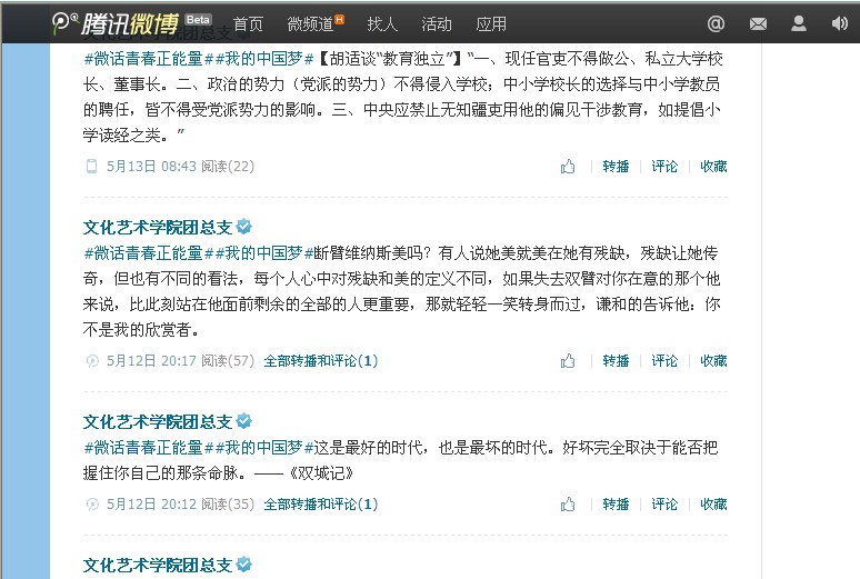文化传播学院团总支于5月6日—5月26日在腾讯微博开展了#微话青春正能量##我的中国梦#微博话题活动,通过这种形式号召女院广大学生为实现国家富强、民族复兴、人民幸福的伟大“中国梦”而发奋学习、不懈奋斗。