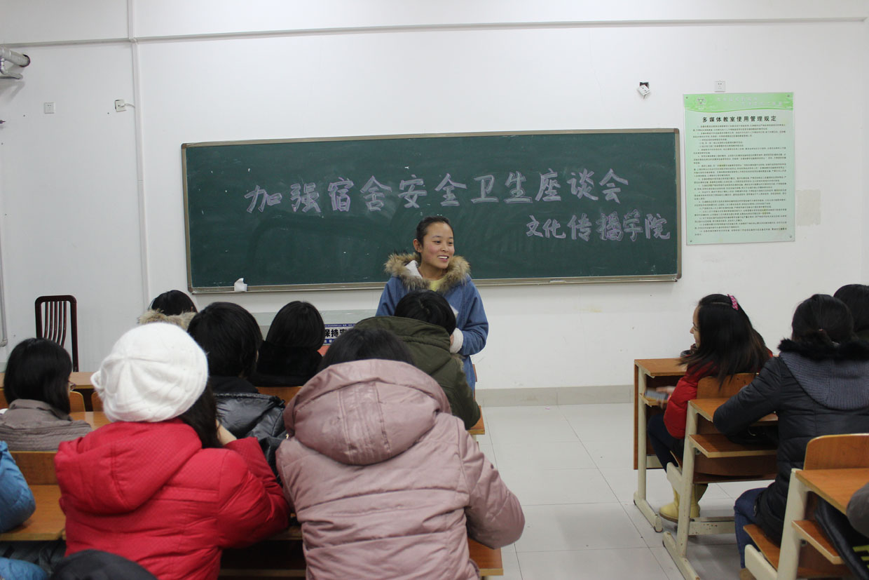 为使新生更好适应大学的宿舍生活,提高同学们的安全和卫生意识,文化传播学院学生会组织安全部、生活卫生部等部门于2012年12月3日晚,在普教楼614教室召开“冬季安全教育月”宿舍安全卫生座谈会,邀请大一各班的纪律委员、卫生委员及各宿舍舍长参加,共同商讨在“学校冬季安全教育月”期间如何更好的保持宿舍卫生、提高安全意识。
