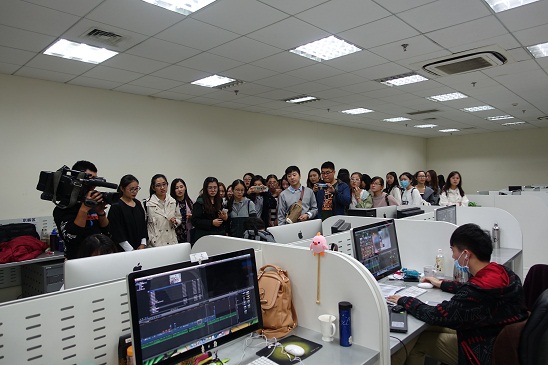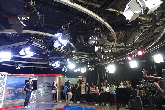在济南电视台,师生一行参观了各类演播和编辑播发部门。作为与山东女子学院第一次合作的参观活动,济南电视台高度重视,破例将大型演播室、实景演播室等所有类型演播录制场所以及节目编辑、播发控制区域向学生们开放,学生亲临演播编制现场,了解到完整的节目生产流程,记录了舞台灯光效果、机位配合、摄像操作等工作细节,详细调研了名牌栏目“有一说一”的运作内容,并与节目主持人启迪进行了互动交流。在参观中,同学们还就节目策划及后期制作等实际操作中遇到的困惑现场讨教,得到电视台专业人士的热心指导。