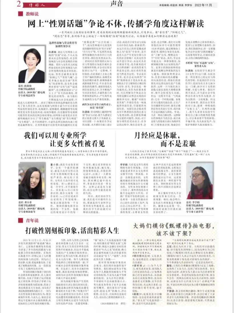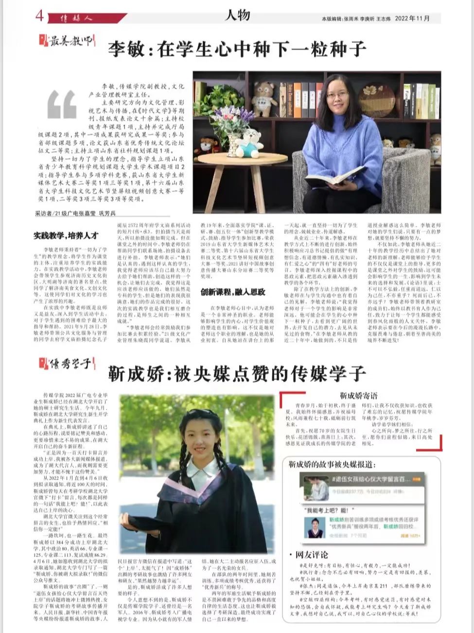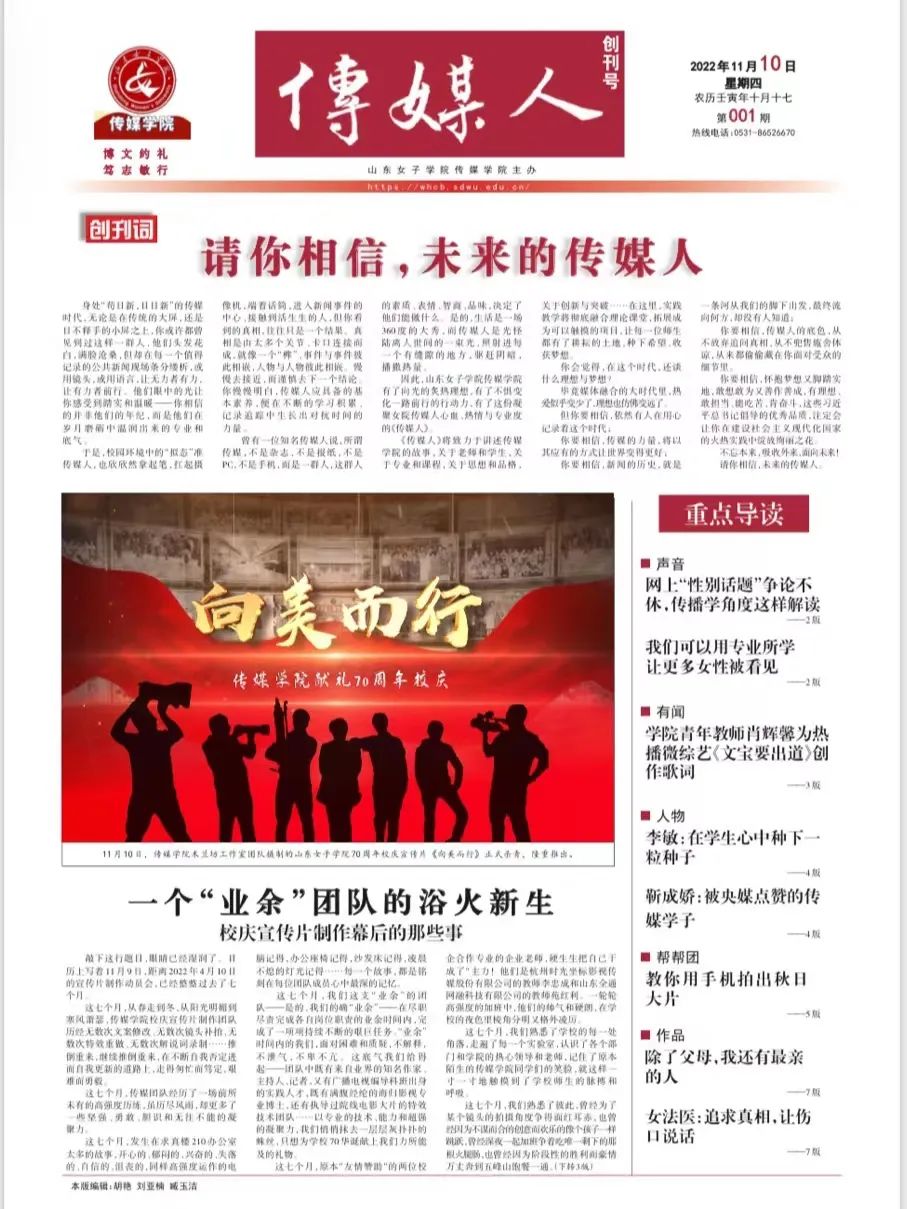 《传媒人》致力于讲述传媒学院的故事,关于老师和学生,关于专业和课程,关于思想和品格,关于创新与突破……以校庆七十周年为契机顺利创刊,《传媒人》负责小组在短短一周时间内完成了策划、筹备、到组稿、合版、校对、定稿等繁重工作,这期间经历过多次推倒重来,始终与时间赛跑。《传媒人》在成长的过程中,刊印属于传媒人的文章,记载着创刊的历程,寄托着木兰坊融媒体实训中心的老师和同学们对《传媒人》情怀。在这一周里,老师与同学们从白天到黑夜,加班加点进行细致的商讨,为了报纸能够顺利如期出刊甚至熬夜到凌晨四点,第二天仍要打起精神进入课堂。老师们从未有过一句怨言,始终保持着高昂的热情和积极的行动,鼓励着同学们一同前行,努力让《传媒人》院报创刊号做到最好。