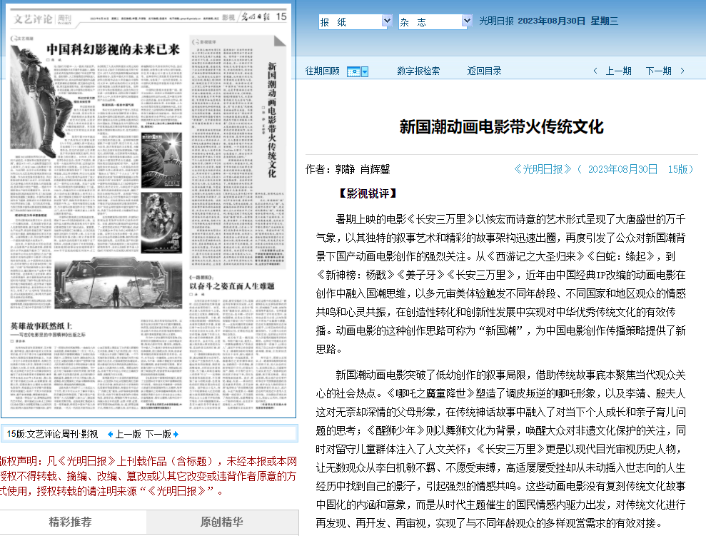 学院副院长郭静副教授、肖辉馨副教授的论文《新国潮动画电影带火传统文化》发表于《光明日报》2023年8月30日文艺评论版。文章围绕近年来上映的新国潮动画电影如《长安三万里》《新神榜:姜子牙》《大圣归来》等展开论述,从主旨立意、视听风格、人物形象、文化价值等角度对这些影片的审美塑造力、话语建构力、跨文化传播力作了精当的评论。文章对新国潮文化潮流的兴起给予了正面、积极的肯定,希望这样的潮流文化能够为弘扬中华优秀传统文化作出更多贡献。