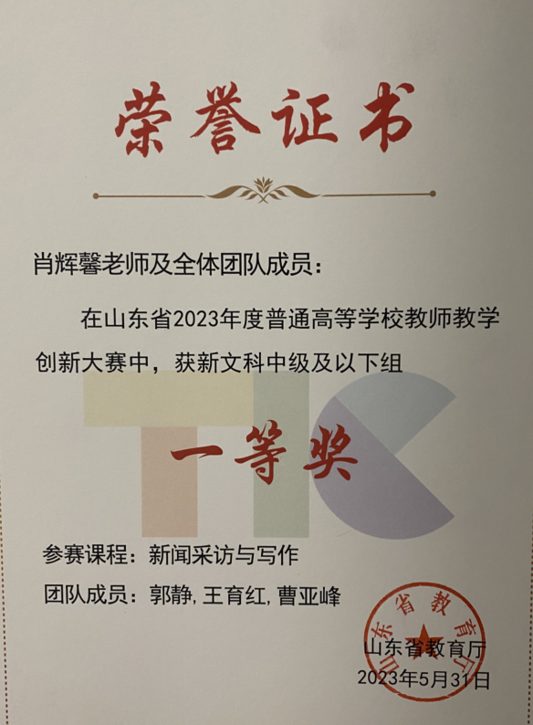 在山东省2023年度普通高等学校教师教学创新大赛中,我院教师肖辉馨、郭静、王育红、曹亚峰教师团队的参赛课程《新闻采访与写作》获得文科中级组一等奖,实现了我校在该项比赛中的历史突破。全省高校教师教学创新大赛由省教育厅主办,共有71 所本科高校、3496 个教师团队、9000 多位教师报名参加,覆盖12个学科门类,经过网络评审和现场决赛,评选出个人(团队)一等奖48项、二等奖92项、三等奖135项,优秀组织奖10项。