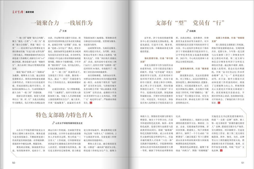学院党总支书记成曙霞教授于《支部生活》2023年第11期发表文章《特色支部助力特色育人》。文章总结了传媒学院党总支紧扣立德树人根本任务,聚焦党建与业务深度融合,不断拓展党建工作高质量发展新思路,在厚植深耕、强基固本中擦亮品牌,赋能发展的工作历程及取得的一系列成果。阐述了学院党总支聚焦特色品牌建设,凝聚干事创业“内核力”,围绕“传媒赋能”实施党总支书记抓党建突破项目,构建“一支部一品牌”矩阵的工作新方法、新思路。