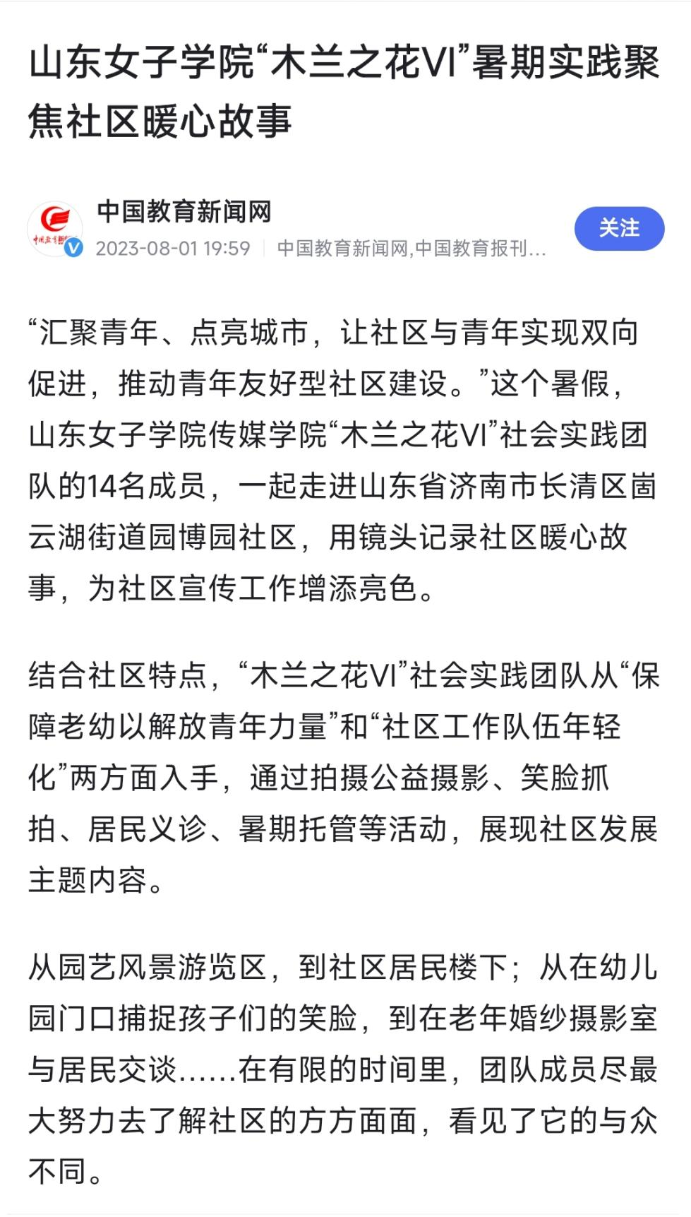 8月,中国教育新闻网发表学院文章《山东女子学院“木兰之花VI”暑期实践聚焦社区暖心故事》。2023年暑假,山东女子学院传媒学院“木兰之花VI”社会实践团队的14名成员,一起走进山东省济南市长清区崮云湖街道园博园社区,用镜头记录社区暖心故事,为社区宣传工作增添亮色。结合社区特点,“木兰之花VI”社会实践团队从“保障老幼以解放青年力量”和“社区工作队伍年轻化”两方面入手,通过拍摄公益摄影、笑脸抓拍、居民义诊、暑期托管等活动,展现社区发展主题内容。学院学团工作队伍秉持勇于创新的工作作风,以奋发进取的精神,稳步推动学院学团工作向前迈进。