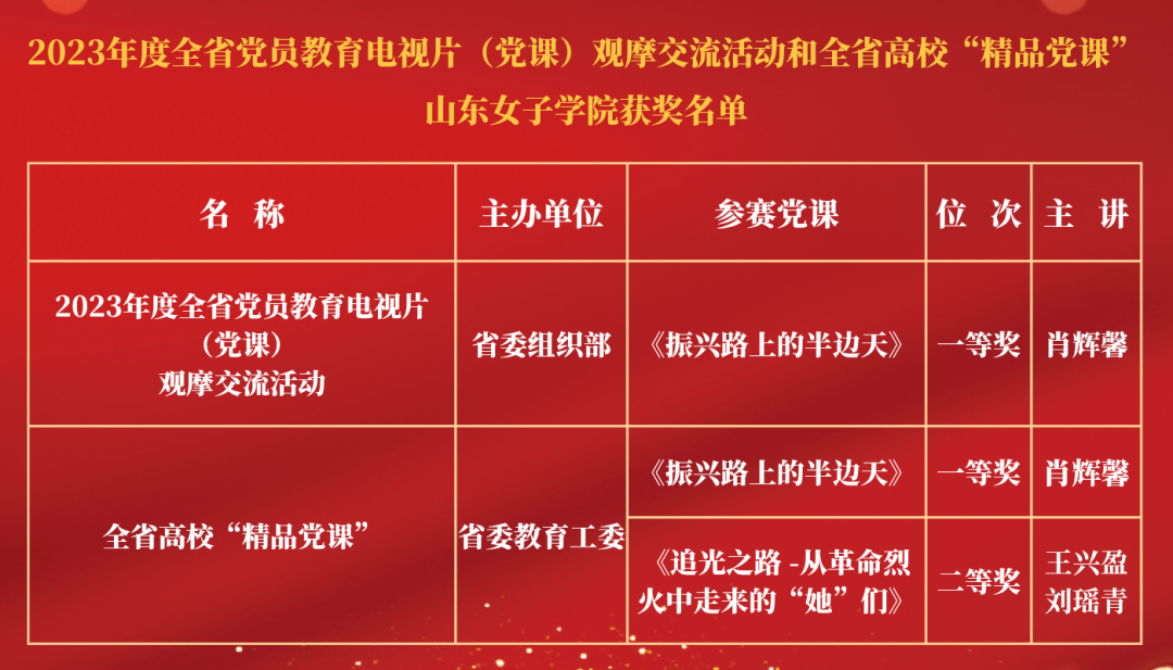 二、学院肖辉馨副教授主讲的《振兴路上的半边天》获2023 年全省高校“精品党课”一等奖、山东省委组织部2023年度全省100部党员教育电视片(党课)观摩交流活动优秀党课一等奖。