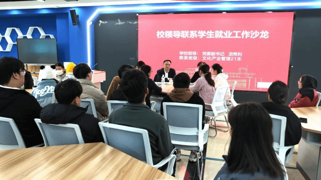 11月28日,学校党委副书记龙希利在求真楼511室与2021级文化产业管理本科班全体同学举行就业工作沙龙并以“如何树立正确的就业观”为主题讲授思政课。此次活动旨在解答同学们关于考研、考公考编、就业等方面的疑问与困惑,并就当前就业形势和政策进行深入解读,引导同学们树立积极的就业观念。学生工作处副处长赵贵阳,传媒学院领导班子成员及辅导员代表参加活动。传媒学院党委书记成曙霞主持本次活动。