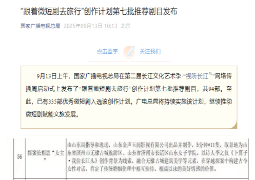 9月13日上午,国家广播电视总局发布了“跟着微短剧去旅行”创作计划第七批推荐剧目。由山东省广播电视局指导和选送、山东女子学院影视传媒中心与山东金声玉润影视有限公司联合制作的网络微短剧《探案长相思“女主”》成功入选,实现我院校企合作、产教融合的新突破。
